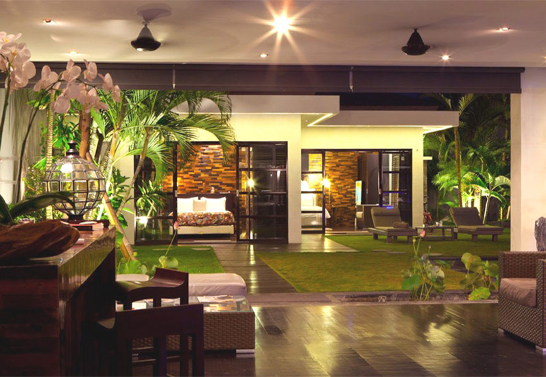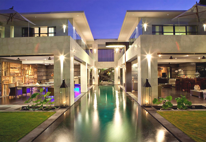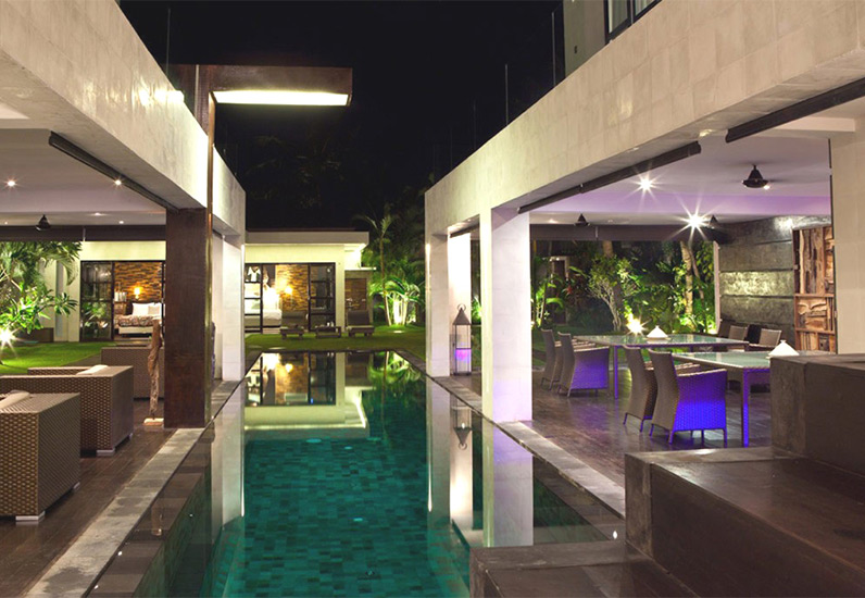 Trần nhà trang điểm với những bóng đèn tròn cùng hệ thống đèn hắt trần hội tụ ánh sáng mang đến 1 không gian huyền ảo, lung linh. Một hồ bơi chạy dọc theo chiều dài sân mang lại vẻ đẹp hiện đại cho ngôi nhà. Mô hình biệt thự đương đại ngày nay thường lồng ghép bể bơi vào trong mang tính thực dụng đồng thời là giải pháp chống nóng hữu hiệu. Tuy nhiên việc đặt hồ bơi ở đâu để làm tôn lên vẻ đẹp của căn nhà lại là việc khác. Nó phụ thuộc vào tài nghệ xử lý không gian kiến trúc của người thiết kế. Tính toán kỹ lưỡng cho hợp với phong thủy và tiện nghi khi sinh hoạt, các KTS đã lựa chọn vị trí đắc địa nhất. Mang hơi nước tỏa khắp không gian trong nhà, xua tan đi sự oi bức những ngày hè gay gắt. Hồ bơi đã làm tăng mỹ cảnh ngôi biệt thự lên 1 tầm cao mới đồng thời thể hiện đẳng cấp thẩm mỹ của gia chủ.