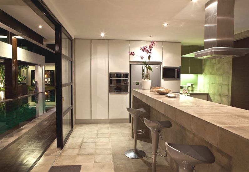 Nội thất phòng bếp là mẫu thiết kế cố định, khối âm tường, được bố trí đẹp mắt, khoa học kết hợp với đồ nội thất thông minh làm nên nét sang trọng tràn ngập căn phòng. Sàn nhà và bếp đảo tích hợp quầy ba cùng một chất liệu gạch ốp là nên sự đồng nhất cho không gian thêm liên kết. Những chiếc ghế quầy bar xinh xắn lạ mắt cũng góp phần hoàn thiện công năng cũng như tính thẩm mỹ của căn phòng.