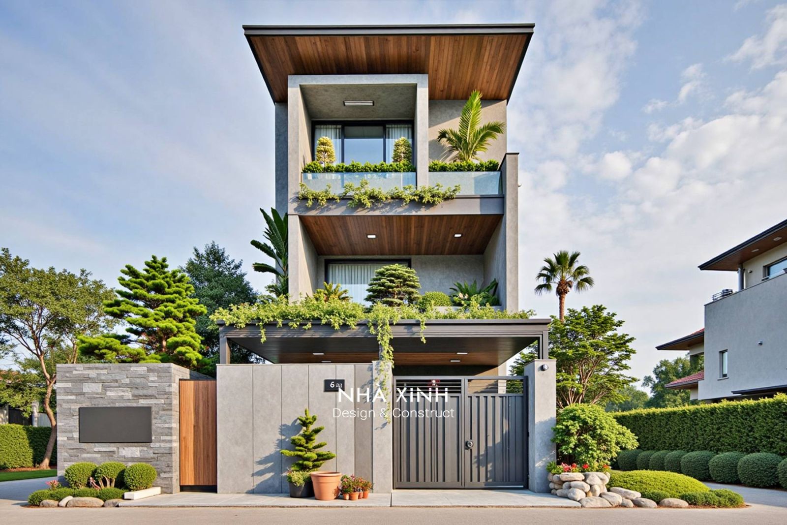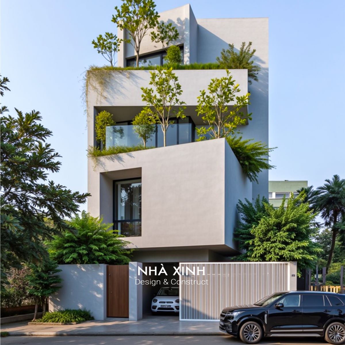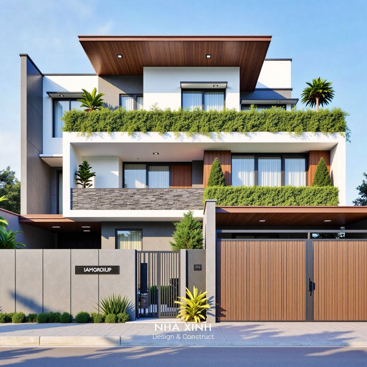 Kiến trúc vuông vắn, mạnh mẽ, tạo cảm giác vữgn chắc và hiện đại. Có thể tận dụng mái làm sân thượng, vườn treo hoặc khu BBQ.