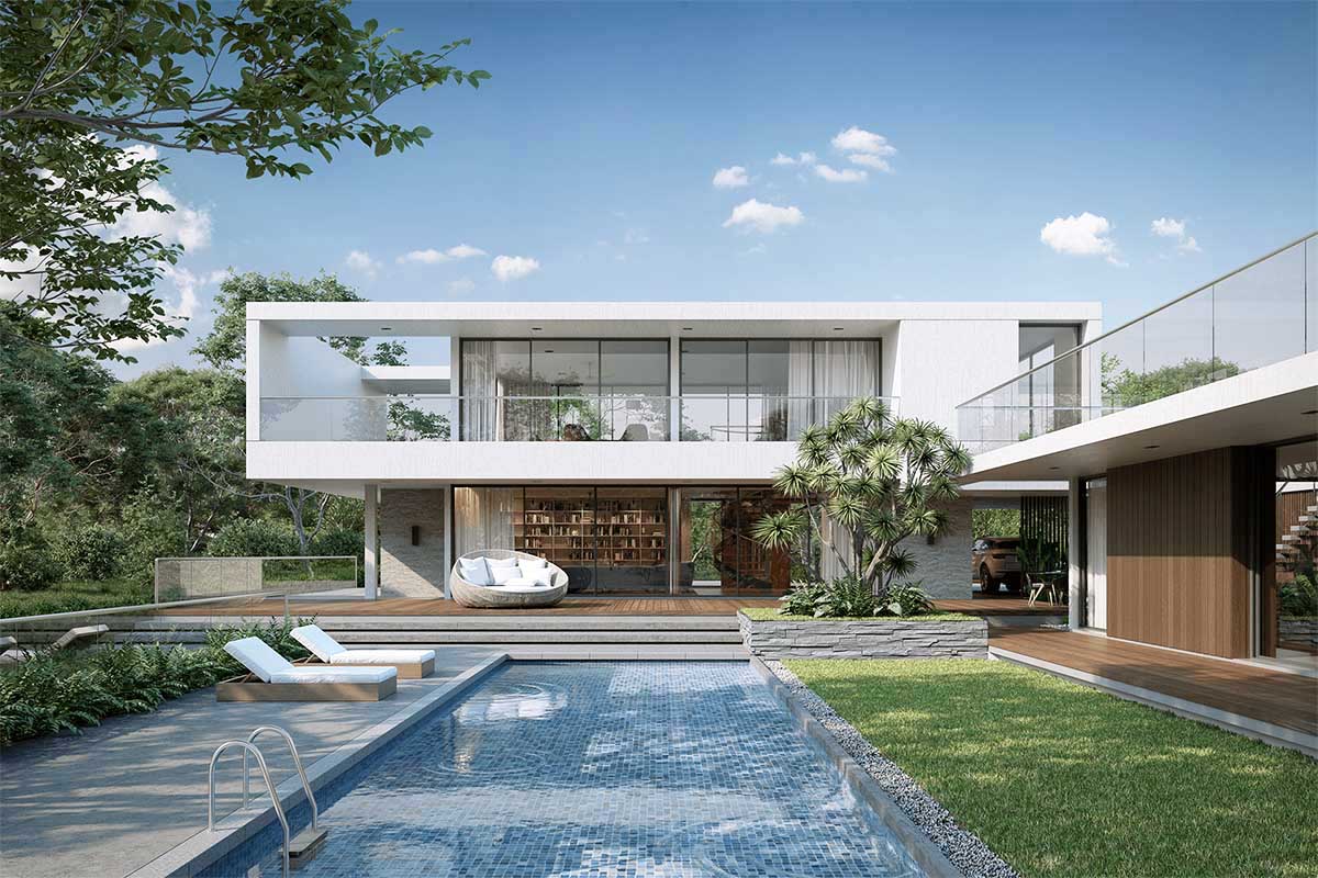 Thay vì xây dựng căn biệt thự lớn đồ sộ, hiện đại xu hướng hiện đại đang chú trọng đến những căn nhà được xây dựng hiện đại, có hồ bơi tại sân vườn, sử dụng những mảng tường hình khối vuông, đơn điệu, kiến trúc sư lại ưu tiên bố trí thêm cửa ban ban công bằng cửa kính cường lực. Căn biệt thự 2 tầng vườn có hồ bơi này đã tạo nên sự kết nối không gian có cây xanh bên trong và ngoài nhà tạo nên nơi sống thư thái cho gia đình, giúp gia chủ dễ dàng bao quát không gian toàn bộ khu vực sân vườn.