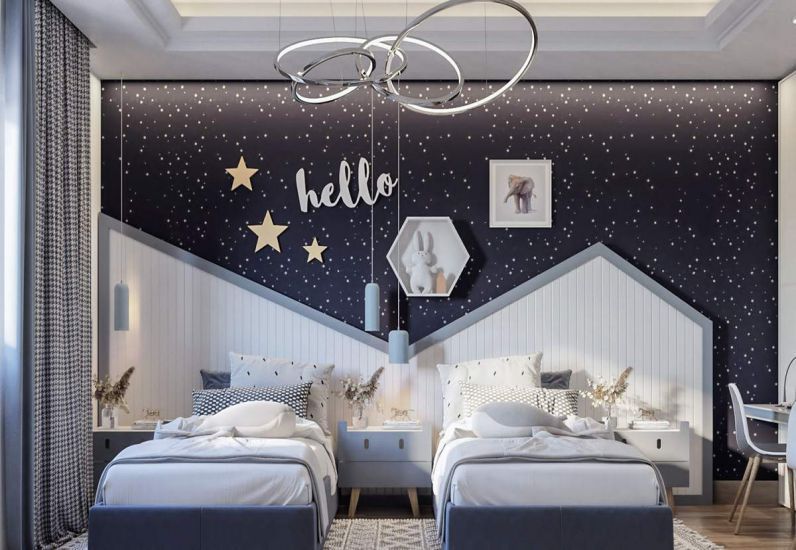 Mẫu phòng ngủ em bé này khoác lên mình một sự mới lạ. Nếu như các thiết kế trên đều lấy cảm hứng từ nhân vật hoạt hình thì với mẫu phòng ngủ em bé này hướng đến một chủ đề rộng hơn - thiên văn học.