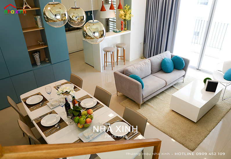 Không gian nội thất khách-bếp thường được kiến trúc sư Nhà Xinh thiết kế dạng mỡ nên có diện tích rộng nên rất thích tương đối rộng, phù hợp cho gia đình yêu thích cây kiểng có thể bổ trí vài chậu xanh tạo điểm nhấn tươi tắn cho căn hộ. Nhà bếp được thiết kế nội thất phong cách hiện đại mang lại sự sang trọng và tính tiện nghi thể hiện sự ấm áp, tạo ra nguồn cảm hứng sáng tạo cho việc nấu nướng của gia chủ.