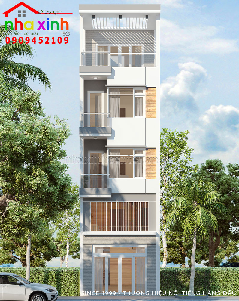 Thiết kế đơn giản, hiện đại, gồm 1 trệt 3 lầu và chia đều các không gian ở mỗi tầng nhằm khắc phục nhược điểm diện tích. Bề mặt trông khá đơn giản nhưng bắt mắt, thân thiện với màu xám nhạt xen trắng làm chủ đạo. Tường được ốp gỗ để có thêm nét mới mẻ, sinh động.