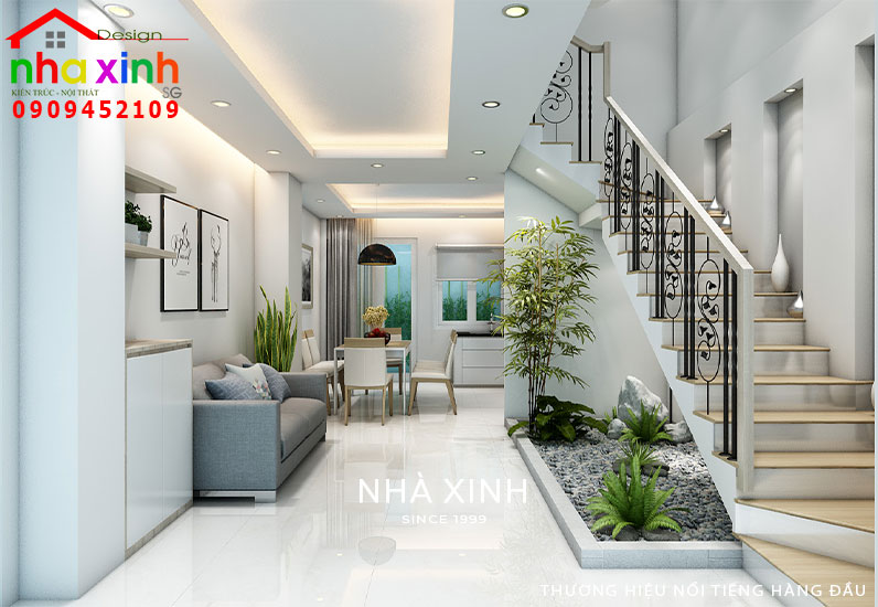 Như đã thấy, sân trước hoàn toàn không có nên phải chừa trống khoảng trước để chứa xe cộ cho nhà và khách đến chơi. Ngay sau đó là cầu thang, bếp nấu, bàn ăn. Phía sau có cửa thông ra vườn sau giúp cho không khí lúc nào cũng được lưu thông toàn bộ. Đặc biệt, tiểu cảnh cầu thang sẽ gây ấn tượng tốt đẹp với những ai lần đầu tới nhà. Một góc xanh trong nhà là đủ để tạo cảm giác gần gũi, bình yên cho tất cả mọi người.
