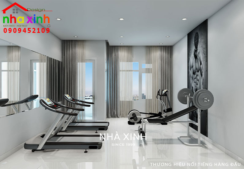 Sau cánh cửa trong là phòng gym của gia đình rất hiện đại và đầy đủ hết dụng cụ.