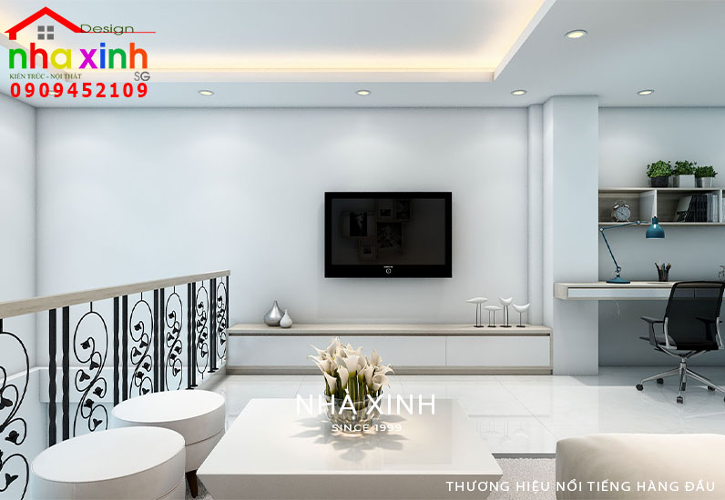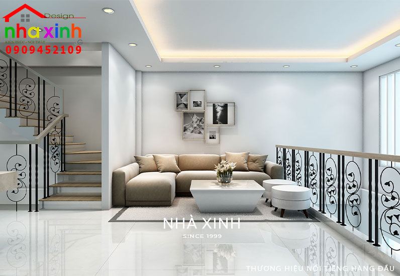 Nơi tiếp khách, sinh hoạt gia đình là ở lầu 1. Lối thiết kế hướng người dùng đến sự đơn giản, tiện nghi trong cuộc sống cho nên các chi tiết thừa thãi đã bị bỏ hết, chỉ có hoa văn trang trí ở lan can. Giếng trời được đưa vào thiết kế như là một giải pháp hoàn hảo để tiếp cận nguồn sáng tự nhiên, cải thiện không khí cảnh sắc trong nhà.