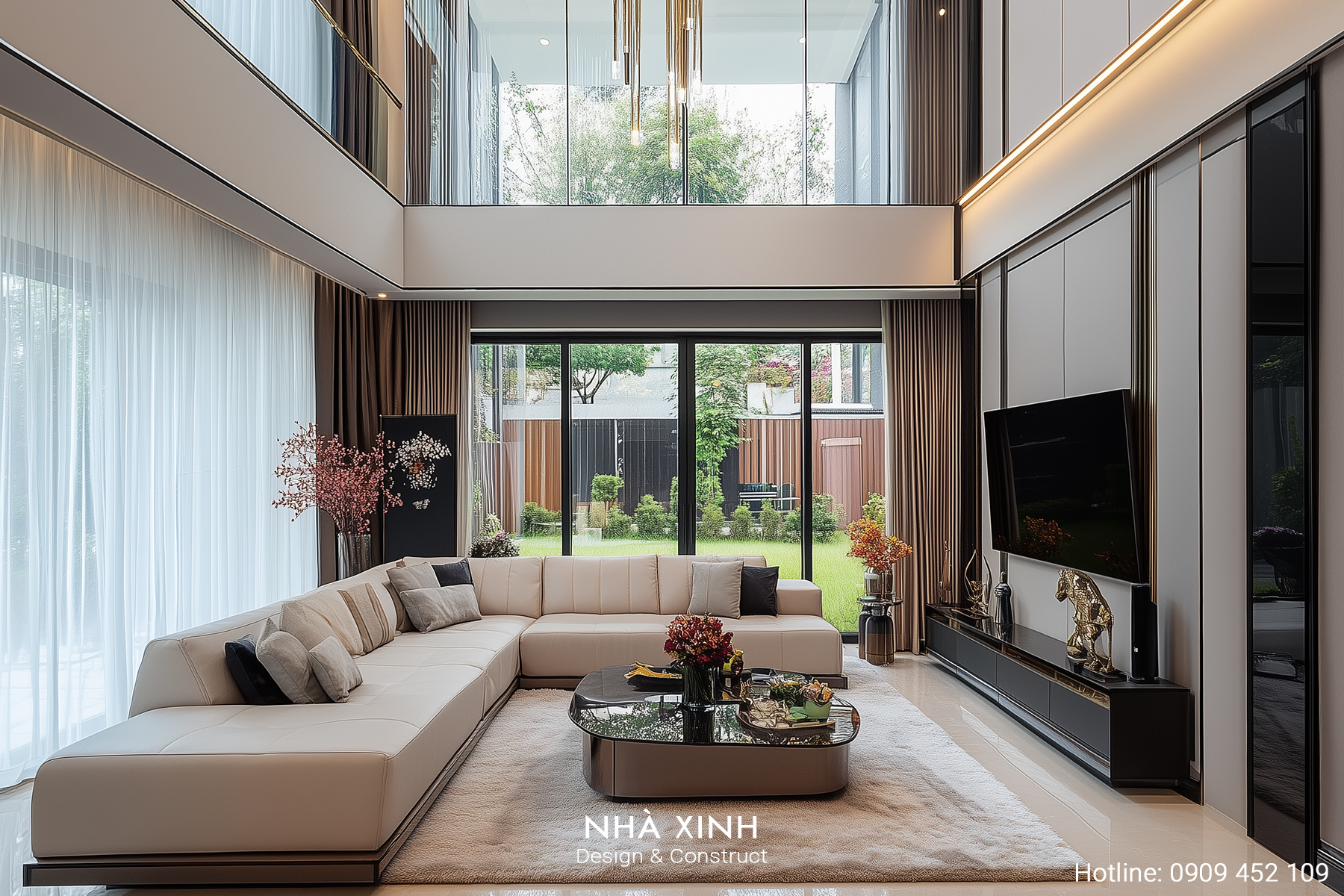 Thiết kế nội thất phòng khách cần bộ sofa chất lượng, bàn trà, kệ TV, đèn chùm hoặc đèn thả.