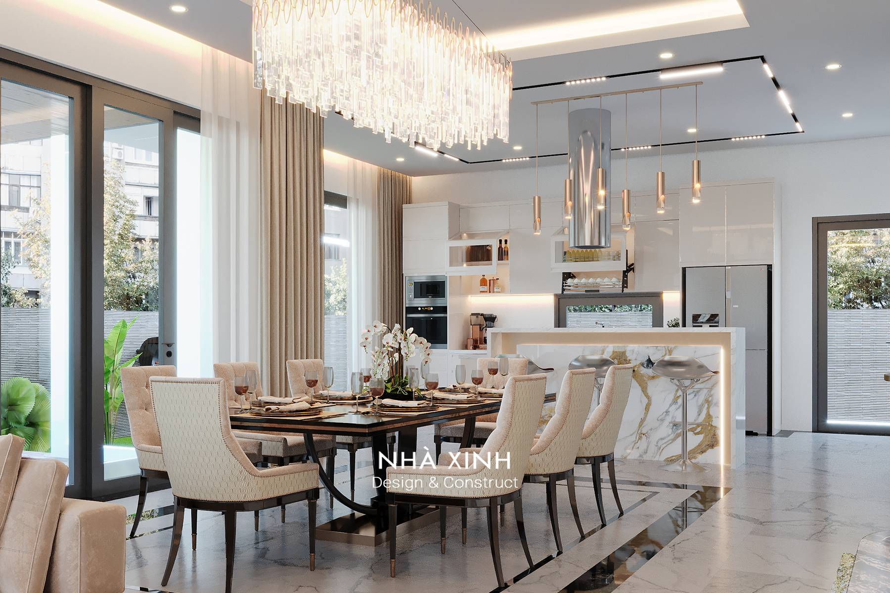 Tủ bếp module, bàn ăn, ghế ăn, đèn thả trần.