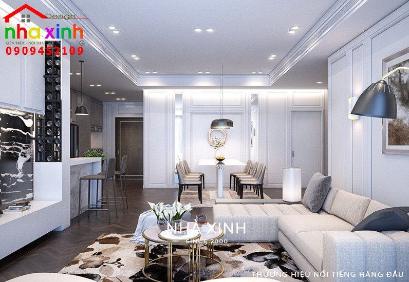 Thiết kế nội thất phòng khách cần bộ sofa chất lượng, bàn trà, kệ TV, đèn chùm hoặc đèn thả.