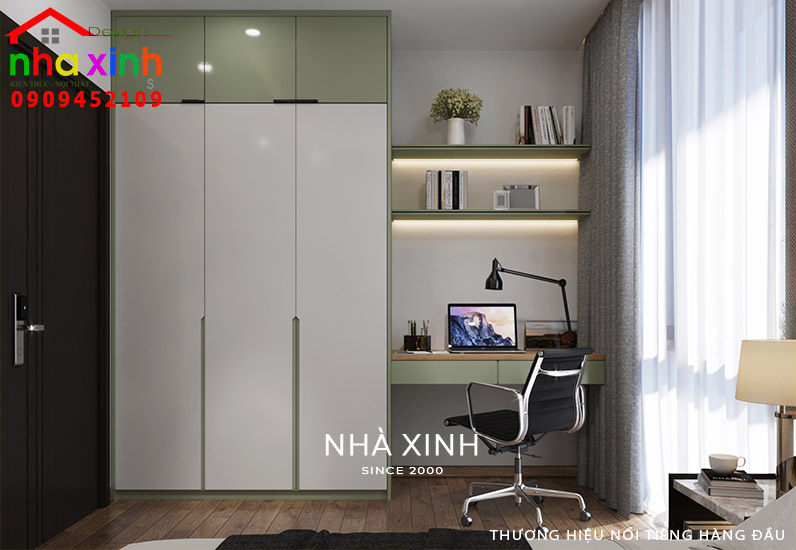 Các khu vực chức năng được tích hợp chung trong phòng ngủ mang đến sự tiện lợiPhòng ngủ con trai gia chủ toát lên sự ấm cúng và nhẹ nhàng. Sử dụng tông màu trắng làm màu sơn tường chủ đạo, tô điểm thêm màu xám trên một mặt tường để tạo điểm nhấn, kết hợp với nội thất có màu xanh lá theo sở thích của chủ nhân.
