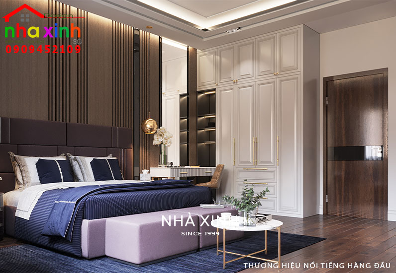 Không gian phòng ngủ được thiết kế kết hợp hệ tủ tiện nghiPhòng ngủ master cho vợ chồng Ông Hùng đã được thiết kế hoàn chỉnh với việc lựa chọn trang trí phù hợp để đảm bảo có một đêm ngon giấc. Bất kể phong cách nào đi chăng nữa kiến trúc thiết kế nội thất mọi thứ đều mang tính khoa học, tinh tế cho người dùng.