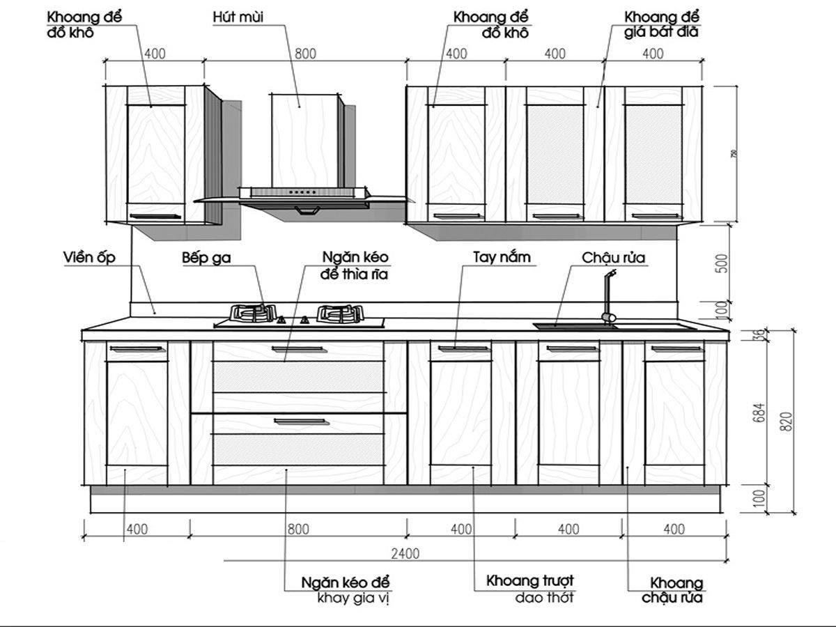 - Chiều cao của tủ bếp phía trên 80cm, và có chiều sâu khoảng 35cm.