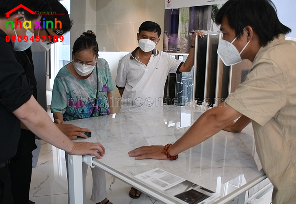 KTS Nhà Xinh cùng với khách hàng xem sản phẩm gạch ý ốp tường