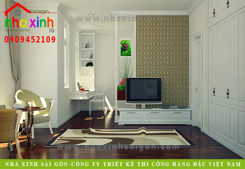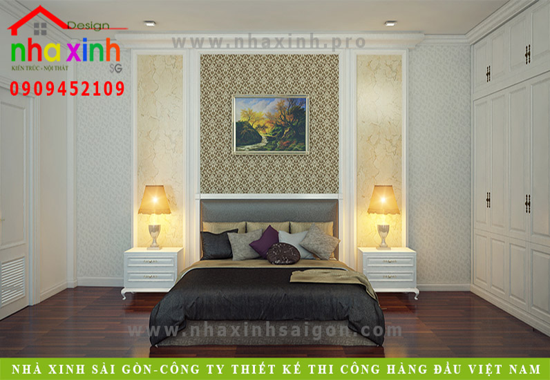 Phòng ngủ các thành viên trong gia đình được thiết kế tương tự nhau nhưng gam màu khác nhau tùy theo lứa tuổi. Việc sử dụng giấy dán tường rộng rãi khiến phòng trở nên bắt mắt, ấm áp hơn, đem lại cho mọi người một giấc ngủ ngon. Có chút bay bổng, lãng mạn với sự kết hợp giữa cũ và mới, cổ điển và hiện đại trong từng chi tiết. Tạo hiệu ứng thị giác tích cực khi sử dụng nhiều loại giấy với các màu sắc khác nhau và đặt bức tranh phong cảnh làng quê châu Âu nổi bật vào chính giữa.