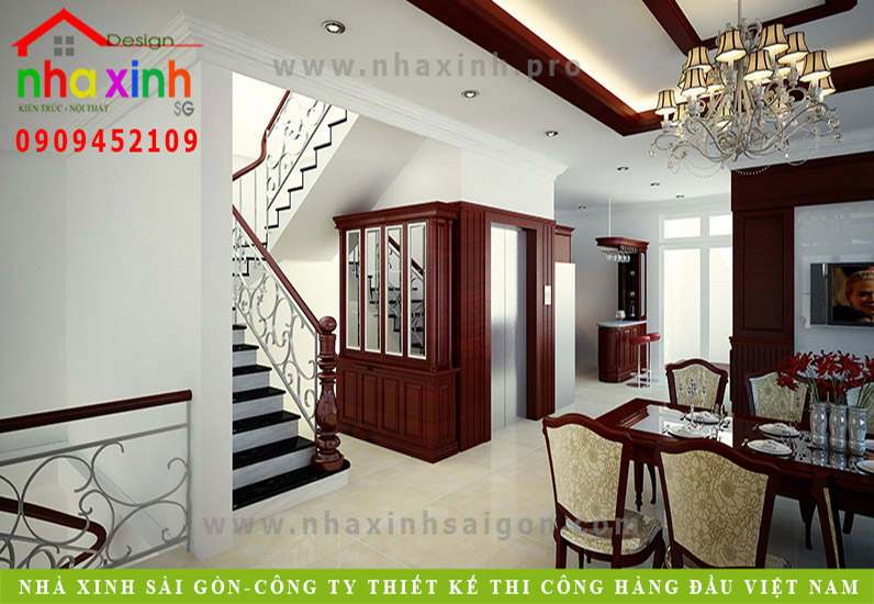 Phòng ăn và nhà bếp được bố trí liền kề với phòng khách. Lấy hồ cá nhỏ cho làm vách ngăn giữa các không gian, đồng thời nhằm mục đích thoả mãn nhu cầu thẩm mỹ và kích hoạt sinh khí cho ngôi nhà của gia đình. Vừa giúp ngôi nhà không bị dàn trải nhưng cũng không quá thô cứng, đúng là một nghệ thuật sáng tạo trong kiến trúc nhà ở. Một bộ bàn ghế sang trọng mang phong cách kiểu bàn ăn của Châu Âu với lối chất gỗ đệm bọc nệm êm, hoa văn chìm rất ấn tượng, cho người ngồi cảm giác được thoải mái và dễ chịu. Cầu thang gỗ gấp khúc cho nằm ở phía bên trong nhằm không gây ảnh hưởng đến quá trình di chuyển và sinh hoạt của mọi người. Kế bên phòng ăn là hệ thống thang máy hiện đại, giúp cho việc lưu thông lên các tầng trên thật sự dễ dàng mà không muốn di chuyển bằng cầu thang bộ. Chứng tỏ chủ đầu tư là người khá tinh tế và khá giả.