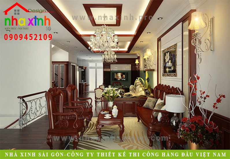 Dáng dấp bên ngoài cổ điển là vậy cho nên từng nội thất trong không gian cũng được trang bị thật ăn ý tổng thể căn nhà. Một bộ bàn ghế gỗ được làm từ nguyên liệu gỗ xoan đào với màu gỗ đỏ thật đẹp mắt, kỹ xảo khéo léo trong từng chi tiết, chạm khắc với hoạ tiết hoa văn thật sắc xảo. Cùng với những chiếc gối ôm nhỏ gọn như góp phần tô điểm cho bộ bàn càng thêm style hơn. Ngước nhìn lên trần nhà nó mang một nét đẹp gì đó thật cao sang, được thể hiện qua phần thiết kế, điểm xuyến bằng những thanh gỗ đỏ cho lõm sâu vào bên trong bằng những đường nét được cách điệu khá nghệ thuật. Cho việc gắn chiếc đèn trần với kiểu hiện đại 1 tầng theo cách chơi của người Tây Âu, nhẹ nhàng mang ánh sáng tinh tế trải khắp căn phòng, thật rực rỡ và sang trọng, thu hút tầm nhìn trông thật quyến rũ. Một chậu hoa hồng màu đỏ rực ở góc nhà, đã nổi lại càng nổi hơn.