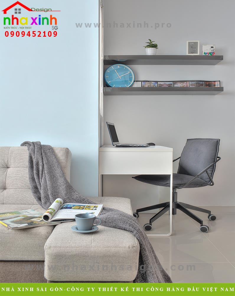 Muốn thiết kế nội thất chung cư nhỏ trở nên rộng rãi hơn, hãy tận dụng ánh sáng tự nhiên đến mức tối đa. Sự kết nối với thiên nhiên giúp không gian trở nên hài hòa hơn. Nếu cần sử dụng rèm cho cửa sổ thì nên lựa chọn loại rèm sáng màu, hoa văn đơn giản để không gian trở nên thoáng mát hơn, mang đến cho bạn một sức sống tươi trẻ. Một góc làm việc thu gọn trong góc phòng, đầy đủ bàn ghế, đèn làm việc, kệ sách, tất cả đều rất nhỏ nhắn vừa vặn với diện tích nhưng vẫn mang lại hiệu quả tích cực cho gia chủ khi làm việc.