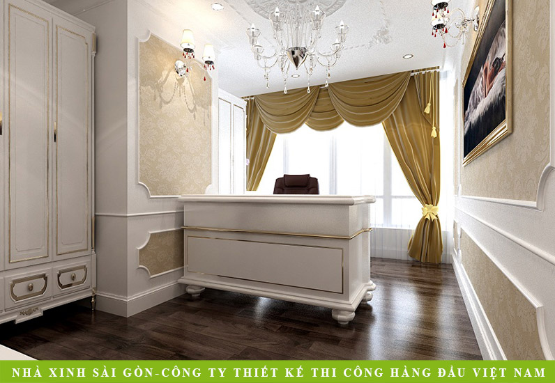 Phòng làm việc lung linh, rực rỡ với gam màu vàng chủ đạo. Trần nhà được chạy với những đường chỉ cho khoét sâu tạo thành hình vòm tròn xoáy sâu tạo ra mảng trần thật hút mắt, đó chính là một điểm nhấn đẹp đầu tiên khi bước vào căn phòng này. Đậm chất cổ điển Châu Âu bởi cách trang trí nội thất trong phòng từ chiếc bàn làm việc vạm vỡ, đèn chiếu sáng và chiếc rèm cửa cũng không thể bỏ qua, nó mang một nét gì đó thật bí ẩn khơi gợi nhiều cảm xúc chất Tây trong ngôi nhà gia chủ.