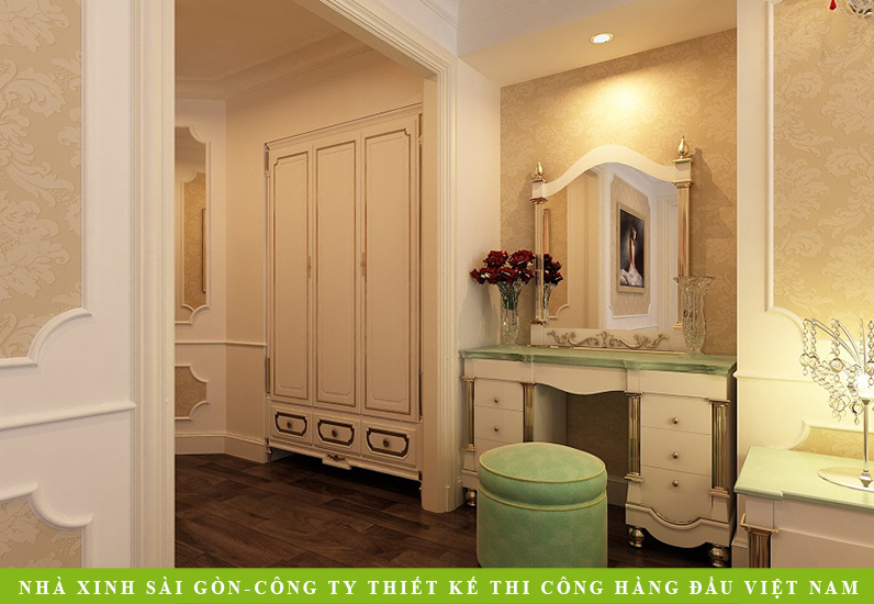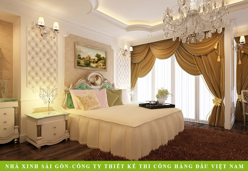 Thiết kế phòng ngủ chiếm vai trò quan trọng trong tổng thể căn nhà xinh này, vì gia chủ thuộc tuýp người bận rộn, cần một chốn yên tĩnh để nghỉ ngơi. Gam màu nhạt khiến căn phòng trở nên nhẹ nhàng ấm áp. Nhìn tổng thể căn phòng ngủ như một nơi nghỉ ngơi của Hoàng Gia mà gia chủ đang mong muốn sở hữu. Các mảng tường phòng được biến tấu kết hợp với hệ thống giấy dán tường với họa tiết hoa văn cổ điển tạo ra một nét sinh động, sang trọng cho căn phòng chị Nhung. Những bức tranh treo trên tường với hình dáng những cô gái, cánh đồng quê nước Pháp rất phù hợp cho việc trang trí phòng ngủ kiểu phong cách Châu Âu này, là một trong những tác phẩm do chính tay chủ nhân lựa chọn nên, chứng tỏ gia chủ là một con người có con mắt đầy thẩm mỹ cao.