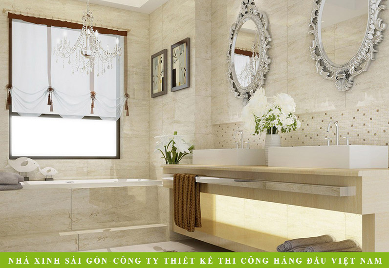 Phòng tắm được lát gạch hoàn toàn bằng gạch men sáng bóng, tạo ra những gì tinh túy nhất từ khi bước chân vào căn phòng tắm này. Những món đồ nội thất được lựa chọn kỹ càng, góp phần làm tăng thêm màu sắc và sự mềm mại hơn. Hai chiếc gương soi hình elip dọc có mạ bạc bên ngoài được gắn trên lavabo giúp gia chủ tiện hơn trong quá trình sử dụng. Sẽ không có gì tuyệt hơn nếu phòng tắm nhà bạn có khung cửa sổ đẹp, mở rộng tầm mắt ra phía bầu trời trong xanh. Bạn sẽ cảm nhận được cảm giác thư thái, được hòa mình cùng thiên nhiên trong lành ngay trong chính căn phòng tắm của mình. Kết hợp với rèm cửa sổ cũng là cách tạo nên sự thích thú cho người sử dụng và vẻ đẹp độc đáo, cá tính cho căn phòng này.