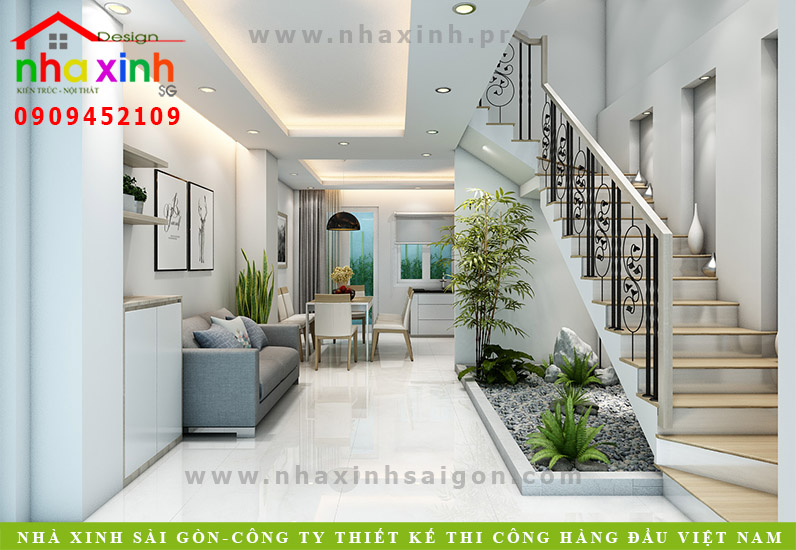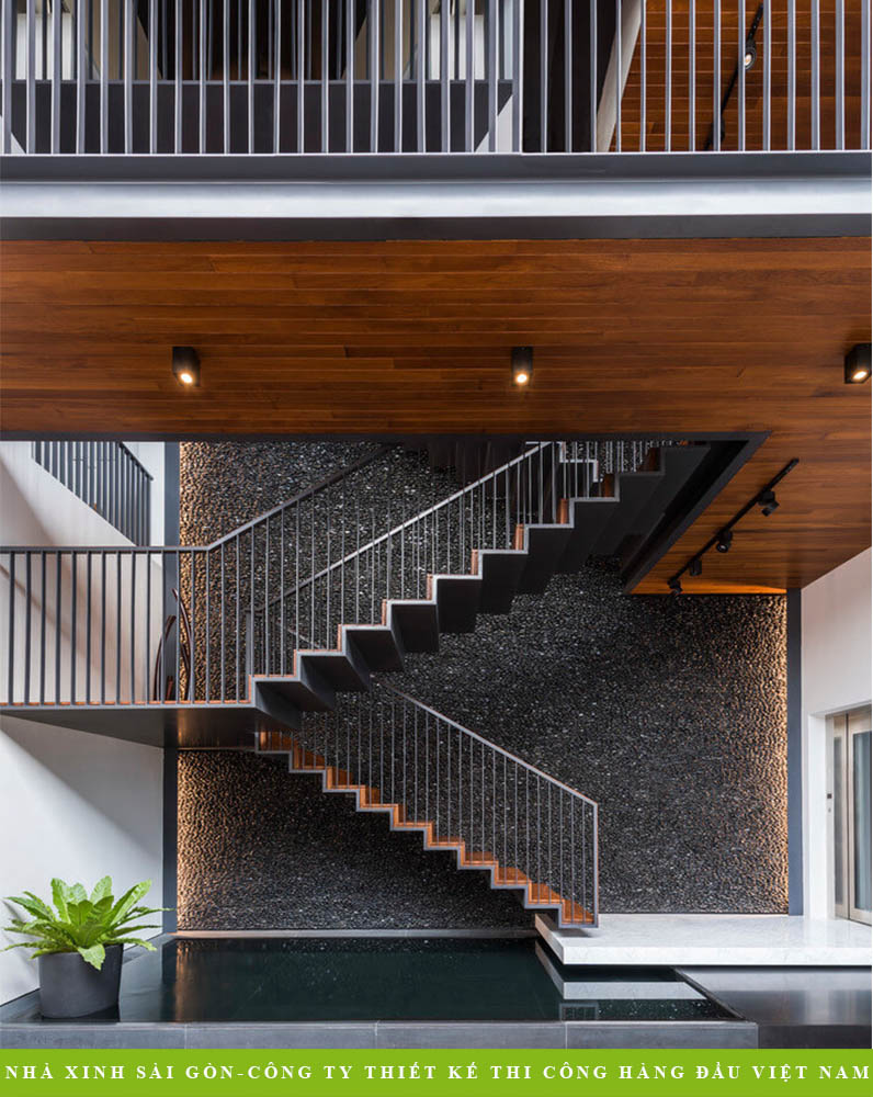 Các mẫu cầu thang đẹp 2022 hình khối, tạo điểm nhấn bởi các bậc thềm với màu sắc tương phản nổi bật. Dưới chân cầu thang là hòn non bộ tô điểm cho thiết kế nhà đẹp.