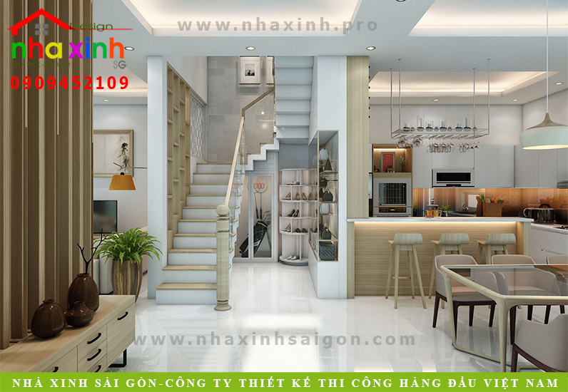 Mẫu cầu thang đẹp nhất hiện nay cho những ngôi nhà phố có diện tích nhỏ, vừa là lối đi lên và cũng là bức ngăn cách cho phòng khách và phòng bếp phía sau, thành cầu thang được trang trí đẹp mắt tạo thành bức phông trang trí hợp với tường nhà và tủ.