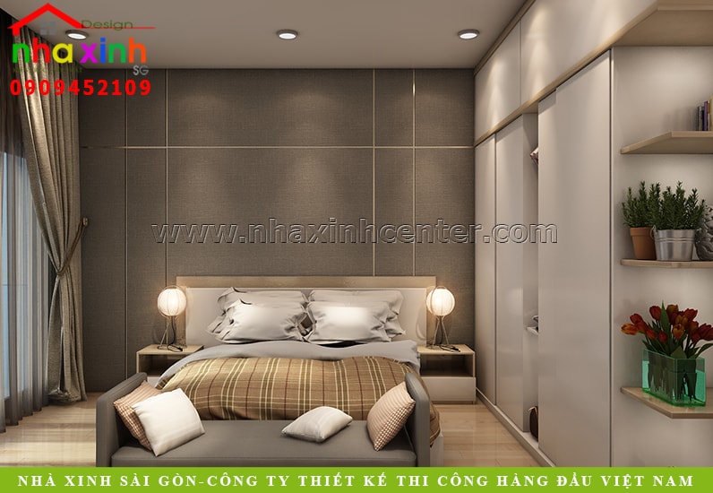 Mỗi căn phòng là một sắc thái thiết kế khác nhau và cũng tùy theo từng sở thích cá tính của mỗi người. Căn phòng ngủ này được KTS lựa chọn với những thiết kế nhỏ gọn bởi nó không những tiết kiệm được diện tích mà còn vừa vặn xua tan đi cảm giác trống trải ở mỗi góc nhà. Giường ngủ kết hợp với chăn ra gối nệm và nền gỗ tạo cảm giác cho người sử dụng sự nhẹ nhàng, yên bình dễ dàng đưa gia chủ chìm sâu vào giấc ngủ.