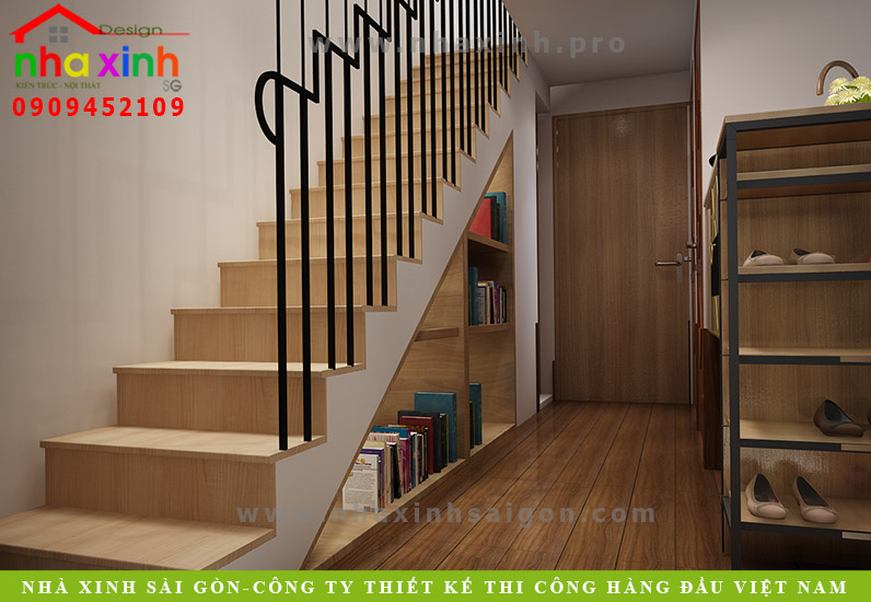 Mặt bằng được thiết kế linh hoạt với hệ thống cửa lùa giấu vách tạo ra sự liên tục của các không gian nhỏ. Lan can cầu thang được sử dụng chất liệu sắt đen mang lại sự hiện đại và mới mẻ. Những gầm cầu thang thay vì bỏ trống, dư thừa để lộ điểm xấu thì kiến trúc sư đã biến đổi thành nơi kệ sách, kệ giày dép rất là đẹp mắt.