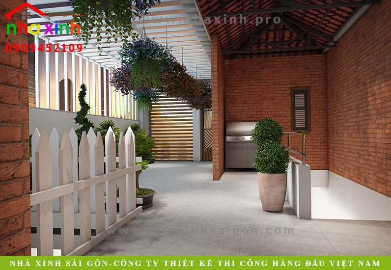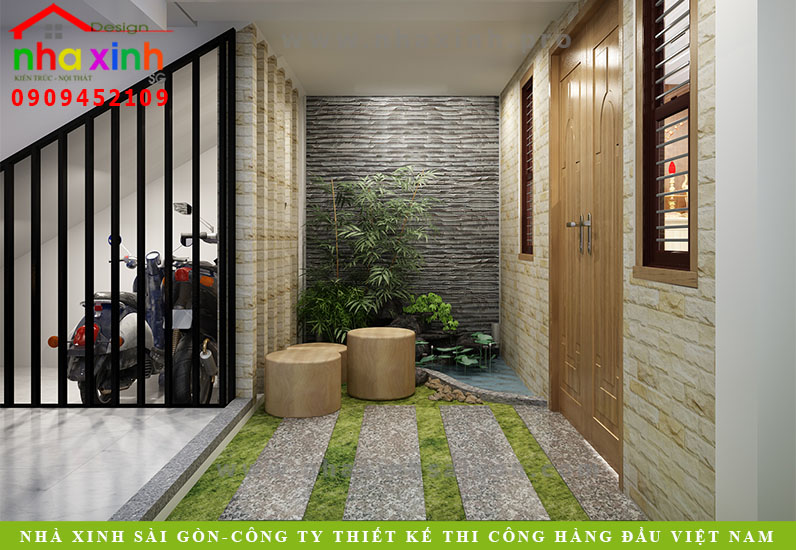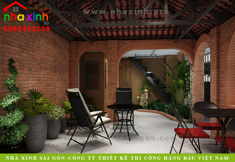 Một ngôi nhà với những mảng xanh tự nhiên và tràn ngập nắng giữa thành phố đất chật người đông này là giấc mơ tưởng chừng như khó, nhưng khi đến với kiến trúc sư Nhà Xinh thì mọi cái khó đều biến thành cái dễ. Xuyên suốt ngôi nhà là kiến trúc hiện đại nhưng vẫn phảng phất nét Á Đông truyền thống với lớp gạch thô màu đất đỏ nung, kiểu mái ngói, cùng với quạt trần, bàn trà đạo và vách ngăn mang phong cách truyền thống.