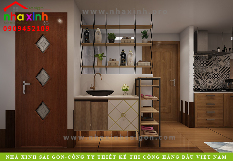 Phòng tắm của tầng trệt bố trí tận sâu phía trong để tiết kiệm diện tích gia chủ đã đặt lavabo phía ngoài cho thuận tiện mọi thao tác.