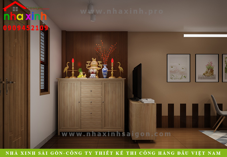 Góc thờ phụng thu nép vào một góc giúp không gian nhà ở càng trở nên yên tĩnh, ấm cúng hơn. Nhờ có tông màu nâu gỗ mà sắc xanh của bộ ghế sofa đơn cạnh tường đã bộc lộ tính năng nổi trội của mình. Qủa đúng thật, mọi thứ trong nhà được đưa vào khá là giản dị, chẳng có gì nổi bật. Những phân vị lam gỗ chạy dọc từ trần xuống nền làm vách ngăn nhẹ giữa các không gian, giúp người xem dễ dàng phân định chức năng khi bước vào nhà.