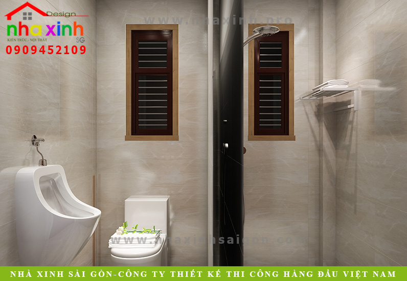 Một nhà vệ sinh khác được thiết kế theo hướng hiện đại không kém. Chỉ sử dụng những nội thất cần thiết. Lavabo nằm cạnh bệ xí, nhà tắm đứng bên cạnh. Cửa sổ tuy nhỏ nhưng vẫn giúp phòng lấy sáng và gió rất là tự nhiên.