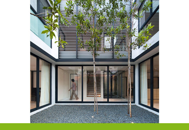 Hông nhà được chừa một khoảng trống thoáng đãng để trồng vài loại cây xanh nhằm thanh lọc không khí trong lành, mát mẻ và thêm cảnh quan. Sự bố trí lồi lõm tạo hiệu ứng thẩm mỹ đặc biệt, nhưng bên ngoài lại không nhìn thấy vì bị rào che khuất. Ghép 3 mảng bê tông lại với nhau hình thành nên khối khiến trúc hoàn chỉnh. Tuân theo luật đối xứng giữa 2 dãy nhà song song, đối diện qua tiểu cảnh sân trước nhưng lại có sự chênh lệch chiều cao 3 dãy nhà.