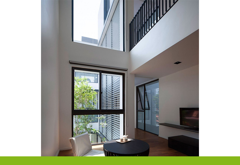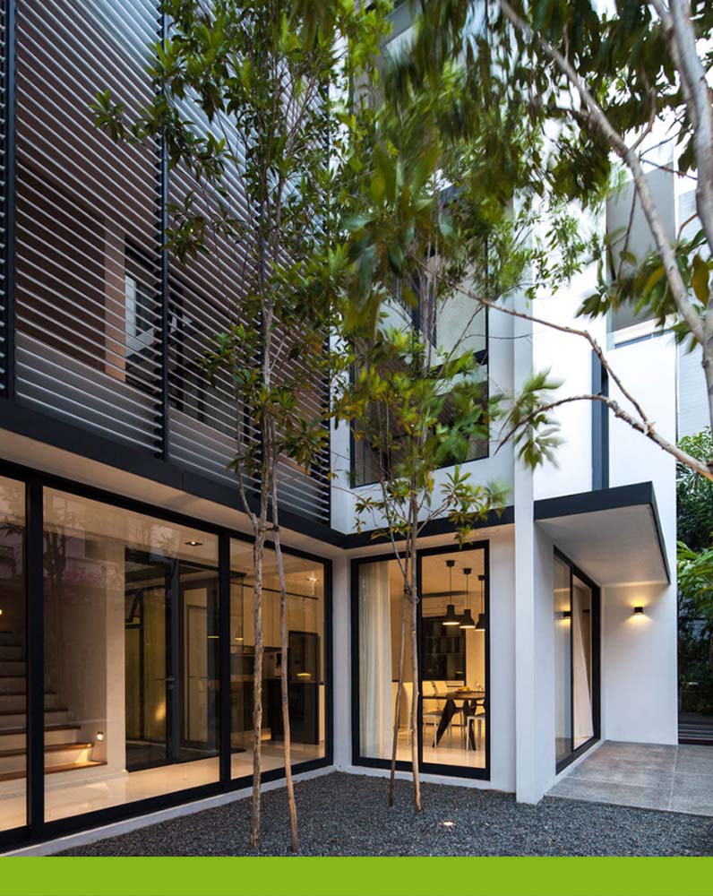 Với hai tông đen trắng phối hợp nhuần nhuyễn, kiến trúc ngôi nhà trở nên góc cạnh và nổi bật. Thiết kế mở với nhiều cửa kính và vách kính tạo nên sự gần gũi và kết nối mọi không gian với nhau. Tấm lam bao phủ ở tầng lầu vừa giúp điều tiết ánh sáng vừa góp phần tạo sự chắc chắn, vững chãi cho ngôi nhà đẹp.