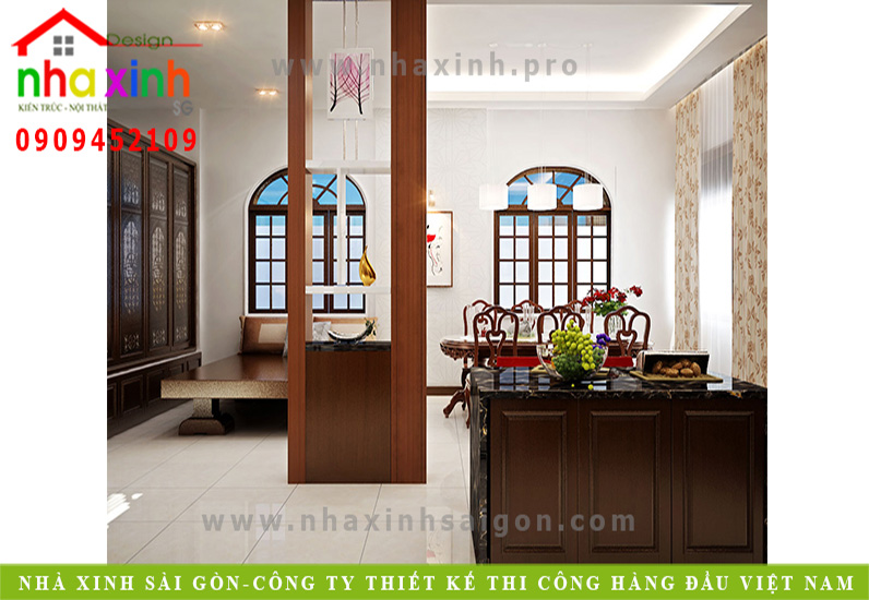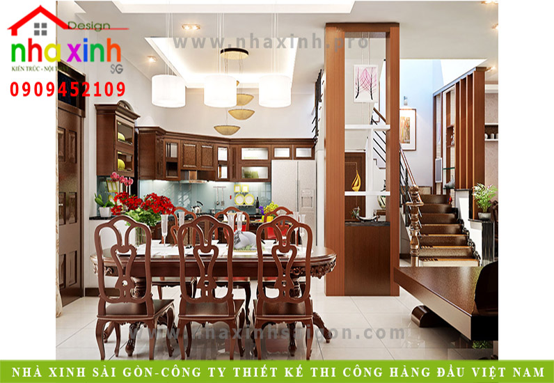 Bàn ăn đặt tại một vị trí khá là phù hợp, không chiếm quá nhiều diện tích không gian, đồng ngôn ngữ nguyên liệu gỗ cho việc thiết kế cộng với chất cổ điển hằn sâu vào trong từng lớp thiết kế cùng với những đường cong bo tròn thật mềm mại, duyên dáng nhưng cũng không kém phần sang trọng. Trang trí thêm cho bàn ăn một lọ hoa tươi thắm, để cho những bữa ăn của gia đình thêm phần hấp dẫn, và khách dùng cơm cũng cảm thấy đầy thân tình hơn.