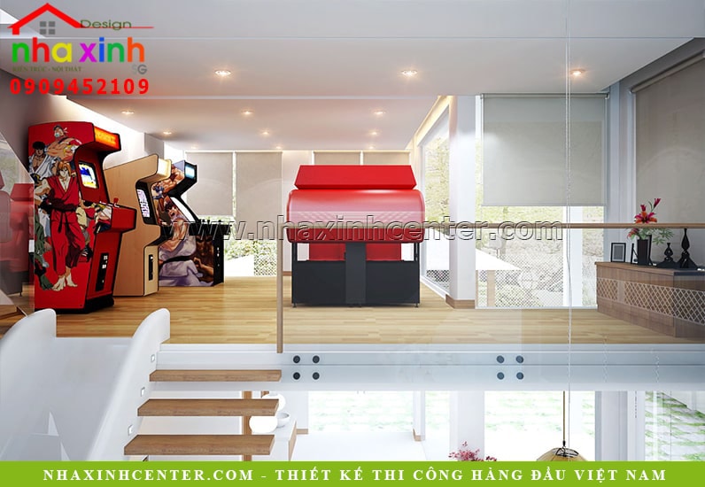 Trên lầu là phòng chơi game của các con. Đặc biệt quan tâm đến các con nên mong muốn dành những gì tốt đẹp sẽ cho con mình, nên đã yêu cầu các KTS tạo 1 không gian vui chơi cho bé thật sự lành mạnh, an toàn mà không phải lo lắng gì cả. Cố ý đặt tại trên lầu để các con có thể vui chơi thoải mái, không làm ảnh hưởng đến các gian phòng còn lại. Ba máy game cho trẻ chơi điện tử để giải trí, thư giãn đầu óc sau 1 ngày học tập mệt mỏi. Bên cạnh đó còn có 1 cây đàn dương cầm để bé tập tành luyện theo nhu cầu.