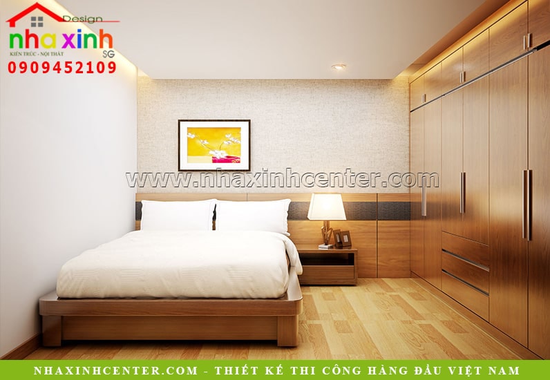 Phòng ngủ thứ nhất mang một nét đẹp thật trầm tĩnh, sâu lắng đáp ứng theo nhu cầu của chủ sở hữu mong muốn có một khoảng lặng để nghỉ ngơi hơn là sự tiện nghi, sang trọng. Là người thích yêu thích sự mộc mạc của gỗ vì thế mà chất liệu gỗ dường như ngự trị chủ đạo trong phòng từ sàn gỗ, tủ kệ, giường.