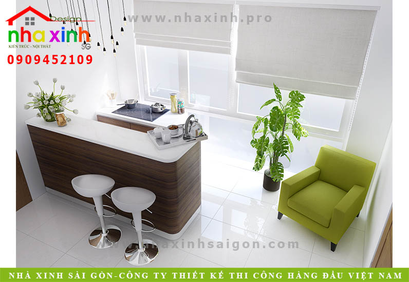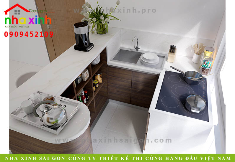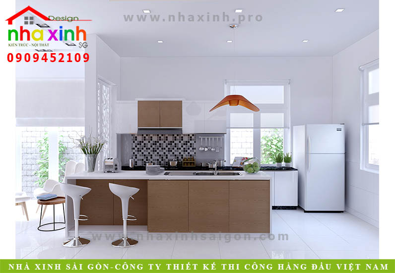 Nhà bếp và phòng ăn nằm liền kề với phòng khách, được ngăn bởi một tấm tường ngắn nên vẫn rộng rãi, liền kề. Màu trắng chủ đạo cộng thêm với thiết kế mở của căn nhà khiến gian bếp lúc nào cũng sáng sủa, mát mẻ. Nội thất bếp đơn giản mà tinh tế, sang trọng. Căn bếp hình chữ U đẹp mắt, sang trọng đầy đủ ngăn kệ cho việc lưu trữ các vật dụng, thiết bị bếp. Một chút sắc xanh lá có tác dụng làm dịu mắt, tạo cảm giác thoáng mát, dễ chịu.