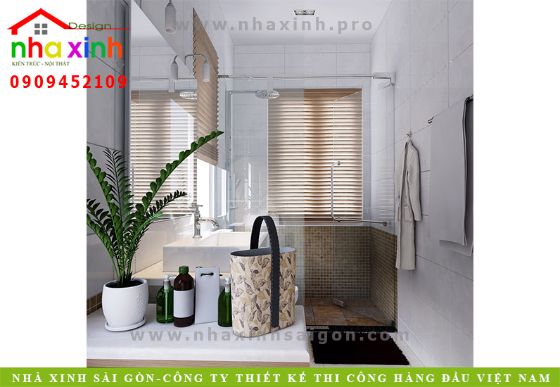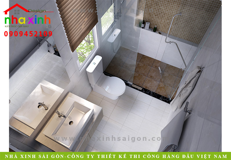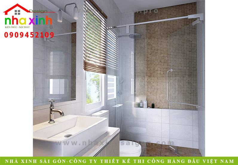 Phòng tắm với đầy đủ trang thiết bị tân tiến, tiện dụng. Sàn trước KTS khéo léo ốp nền bằng loại gạch trắng để tạo sự sạch sẽ, tươi mới, với bên trong thì ngược lại với tông màu ghi sậm đặc biệt có chất bám dính khá cao để không phải gây trơn trượt khi tiếp xúc trực tiếp với nước. Gia chủ bố trí cửa sổ hướng ra vườn nên lúc nào cũng tràn ngập ánh sáng, giúp phòng không bị tù túng. Phân chia khu vực sử dụng khá là rõ ràng, những chiếc tủ quần áo bố trí bên ngoài, lavabo đặt cạnh bệ xí và trong cùng là nhà tắm đứng. Xem thêm 999 mẫu thiết kế biệt thự đẹp 2022