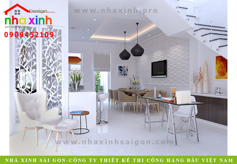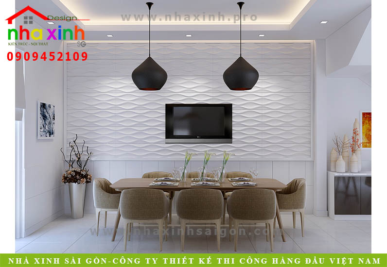 Tạo điểm nhấn cho kiến trúc bằng một mảng tường trắng tạo gợn sóng uốn lượn khá nghệ thuật và đẹp mắt, để tạo được chiều sâu, ấn tượng khi bước vào trong. Một chiếc tivi được bố trí ngay bàn ăn để mọi người có thể vừa ăn vừa theo dõi tin tức.