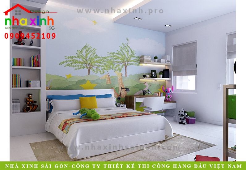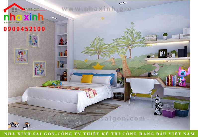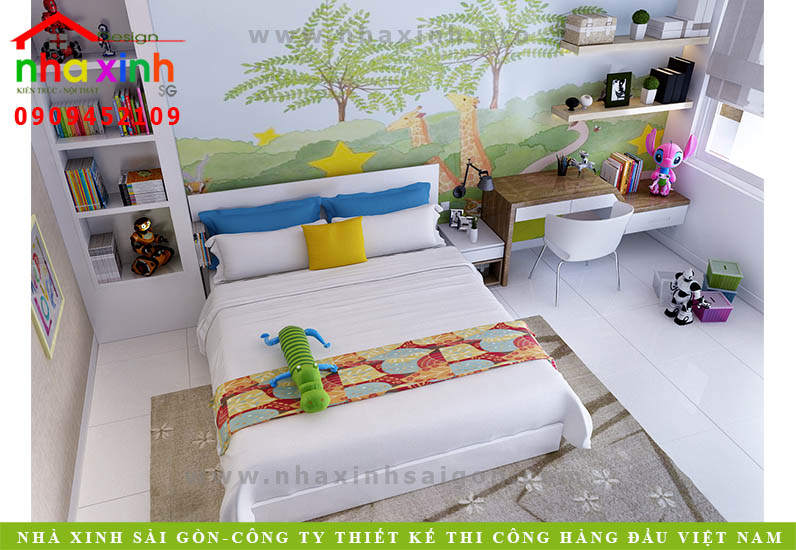 Phòng ngủ con của gia chủ được thiết kế riêng biệt với màu sắc tươi vui, sáng sủa với các bức tranh hoạt hình dễ thương sẽ làm bé thích thú. Để bé có thể tự do tưởng tượng ra một thế giới cổ tích siêu đáng yêu ngay tại căn nhà của mình. Các trái banh, cúp, và các màu sắc đậm sẽ làm cho phòng bé thật thú vị. Những bức tranh màu đỏ treo trên tường màu xám. Giường của bé được sơn màu đơn sắc là một cách tiện dụng trong cách bố trí phòng của bé bởi vì bạn có thể tha hồ chọn các loại chăn ga gối khác nhau để tô điểm và làm mới căn phòng. Song hành với chỗ ngủ là một góc học tập nho nhỏ, vẫn có ngăn kệ để bé có thể đặt sách vở được gọn gàng nhất.