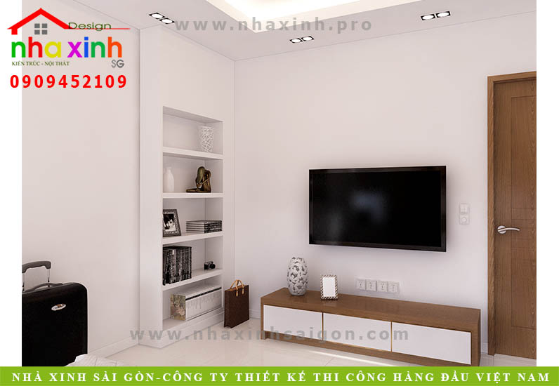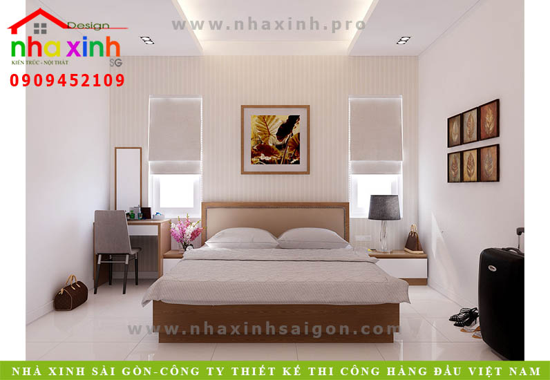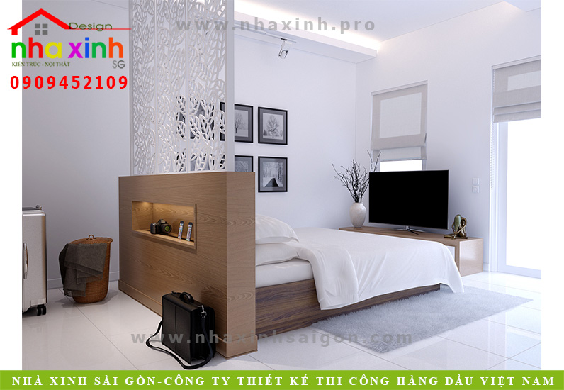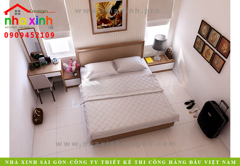 Căn phòng ngủ thứ 2 được thiết kế, trang bị giống cấu trúc phòng ngủ của gia chủ nhưng màu sắc có vẻ tươi sáng, trẻ trung hơn để hợp với tính cách trung thiếu niên. Giấy dán tường nhẹ nhàng bao bọc ngay phần cạnh tường để phần nào che lấp đi sự khô khan của hai cánh cửa sổ mà KTS đã trang bị nên. Và cũng nhờ có cửa sổ mà căn phòng luôn đón nhận được sự rộng rãi, thoải mái. Góc trang điểm nhỏ nhắn đặt ngay cạnh giường để thuận tiện cho việc di chuyển, sử dụng. Ti vi âm trực tiếp vào tường nhằm tiết kiệm diện tích, tận dụng bức tường tại vị này, cách điệu xây lõm vào vài phân làm thành chiếc kệ nhỏ để sách và các vật trang trí theo ý muốn gia chủ.