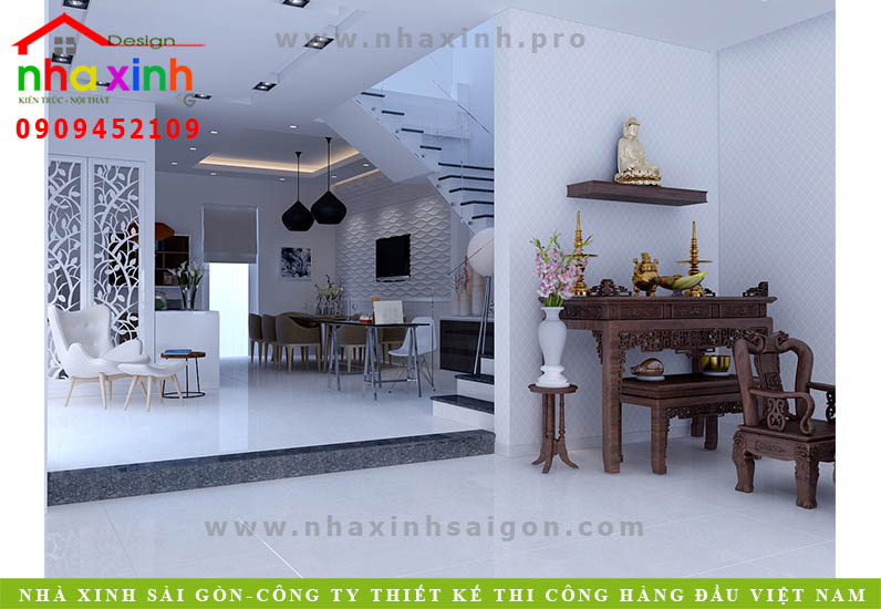 Lấy tấm tường thô dựng đứng làm vật ngăn cách giữa phòng khách và khu vực sinh hoạt. Sự sáng bóng của gạch men sàn tinh khôi, mát lạnh đến độ ta có thể tự mình soi gương tạo nên sự dịu mắt, tươi sáng và tràn ngập năng lượng.