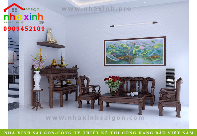 Căn nhà được thiết kế theo hướng mở nên lúc nào cũng tràn ngập gió và ánh sáng. Phòng khách đơn giản đến mức tối đa, chỉ có bộ bàn ghế gỗ và một bàn thờ Phật được chạm khắc theo kiểu xưa. Đôi khi sự đơn giản, không cầu kỳ này lại mang đến cho ta một cảm giác thoải mái, thoáng mát mỗi khi bước vào căn nhà.
