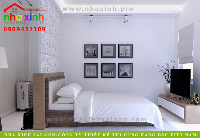 Gia chủ yêu màu trắng nên phòng ngủ của anh cũng được sơn màu trắng chủ đạo. Không gian phòng ngủ không quá rộng nhưng vẫn không quá bí bách, với đầy đủ trang thiết bị hiện đại. Gia chủ đặt tấm hình cưới của mình ở trên tường đầu giường khiến nơi đây trở nên ấm áp, riêng tư, tình cảm dành riêng cho hai vợ chồng. Hệ thống đèn điện đơn giản, giúp căn phòng thêm gọn gàng, rộng rãi hơn.