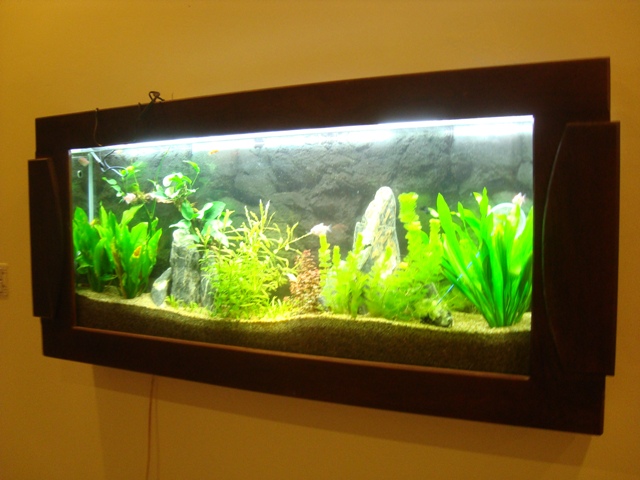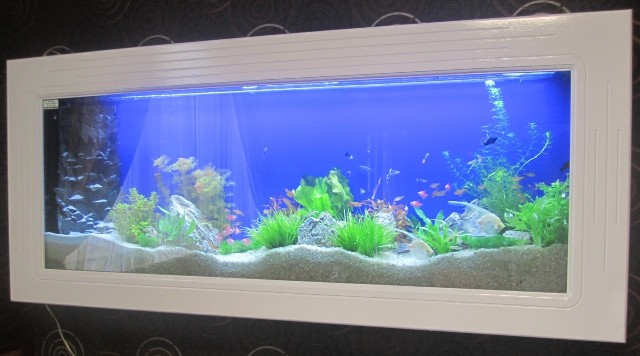 Thay vì dùng tranh ảnh hay kệ trang trí, bạn có thể làm cho bức tường nhà bạn sinh động hơn bằng những bể cá treo tường.