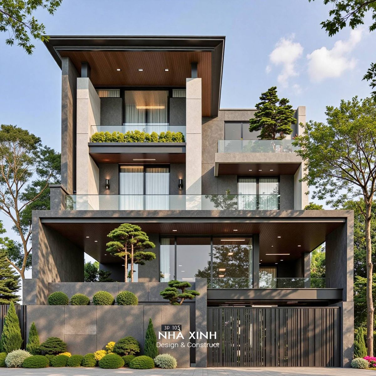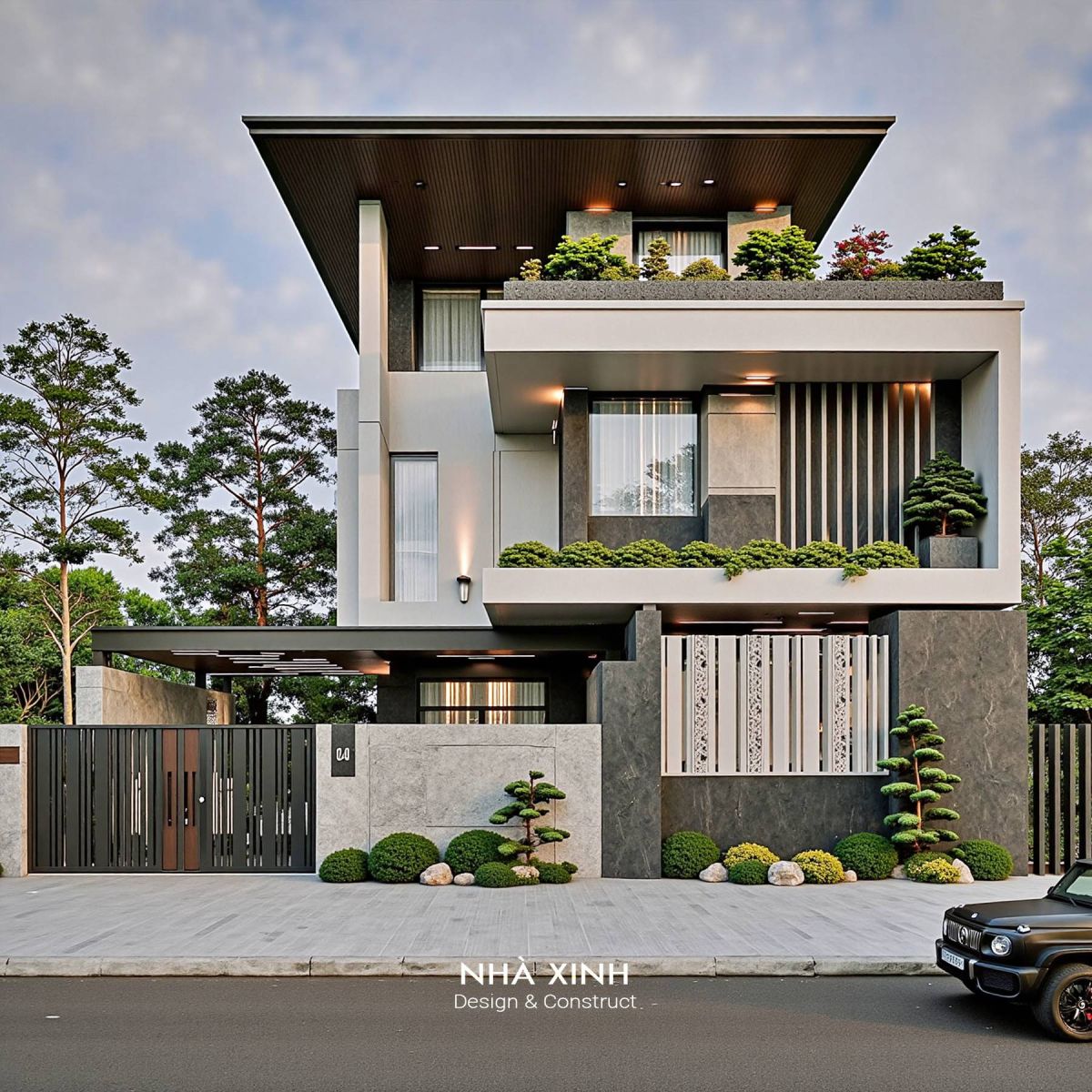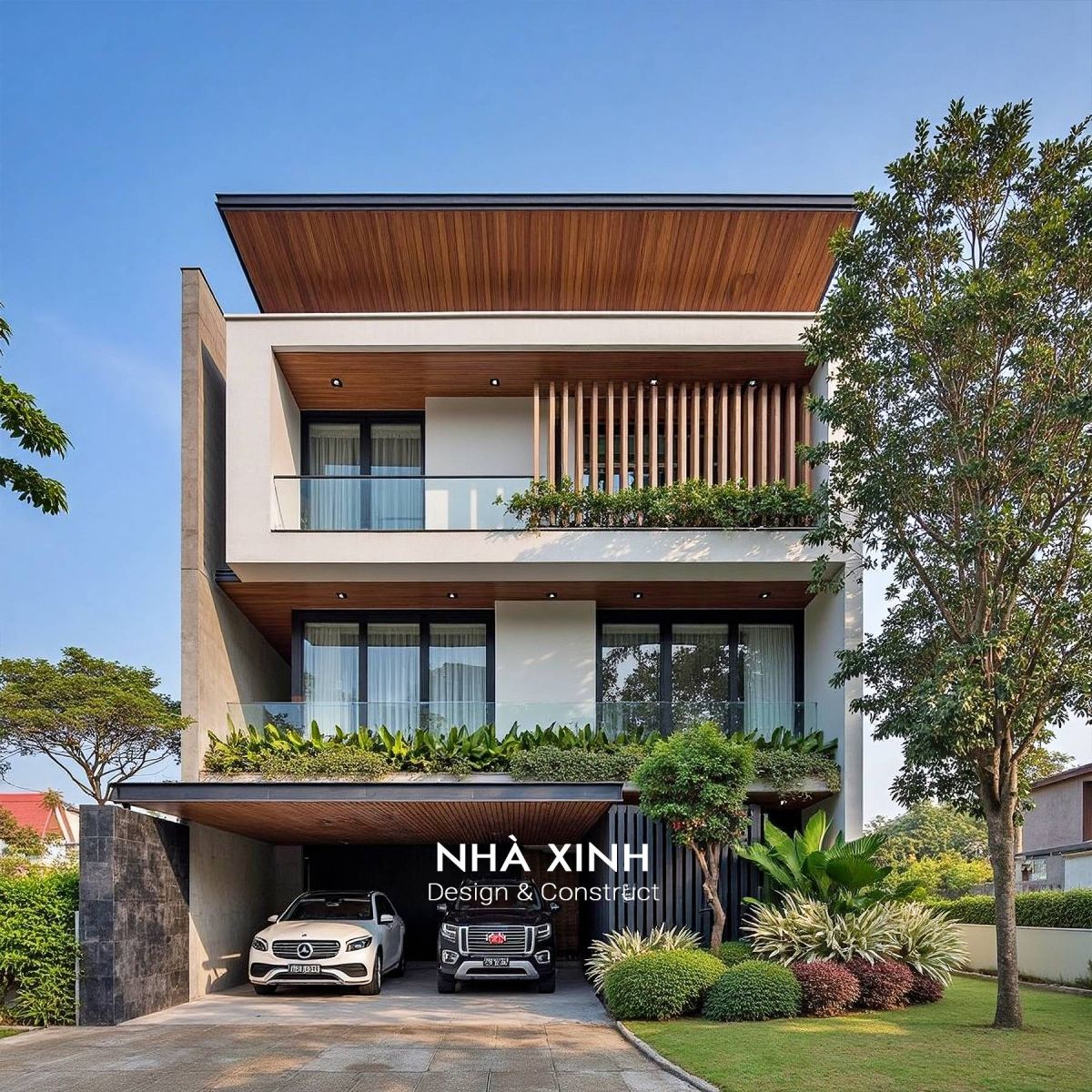 Kiến trúc vuông vắn, mạnh mẽ, tạo cảm giác vữgn chắc và hiện đại. Có thể tận dụng mái làm sân thượng, vườn treo hoặc khu BBQ.