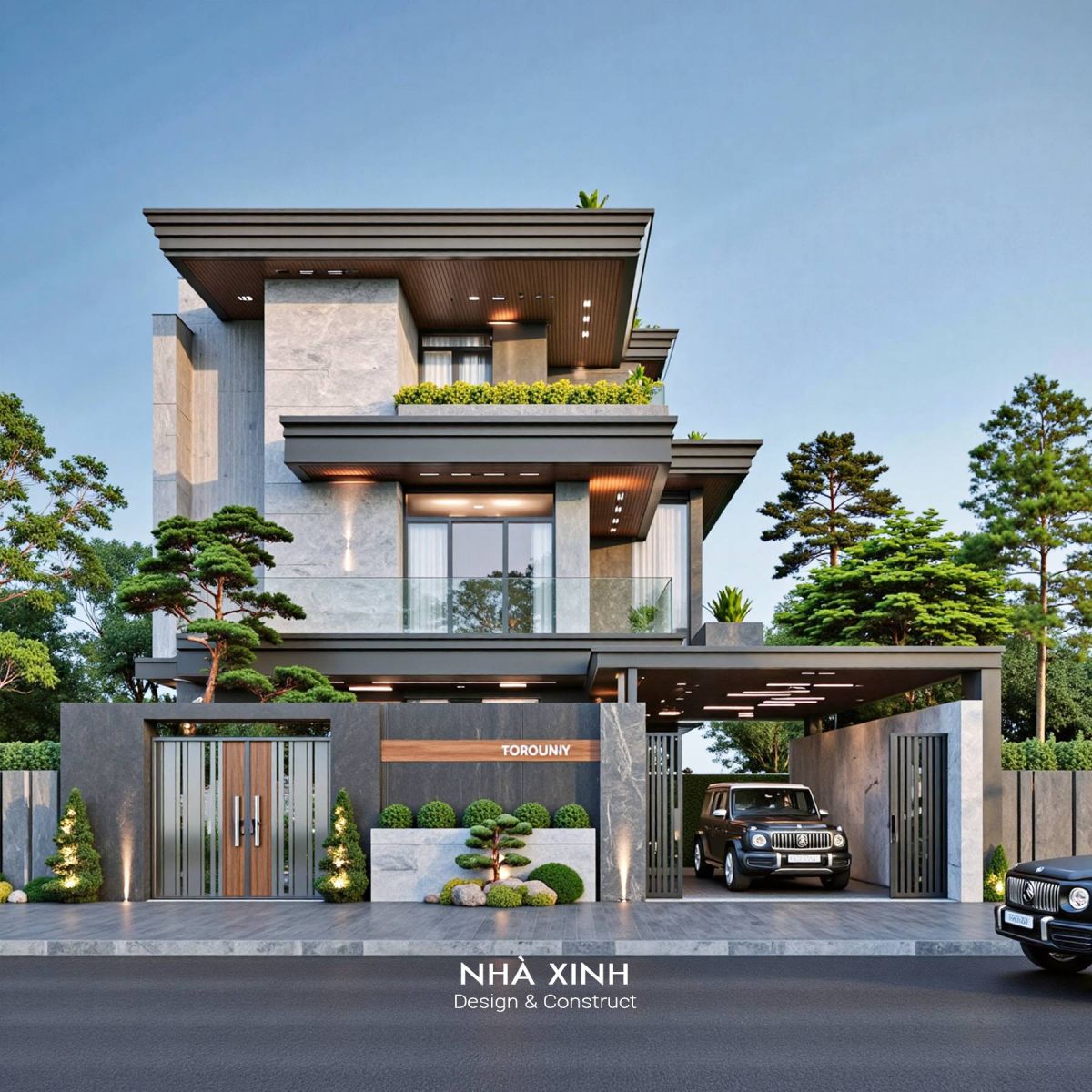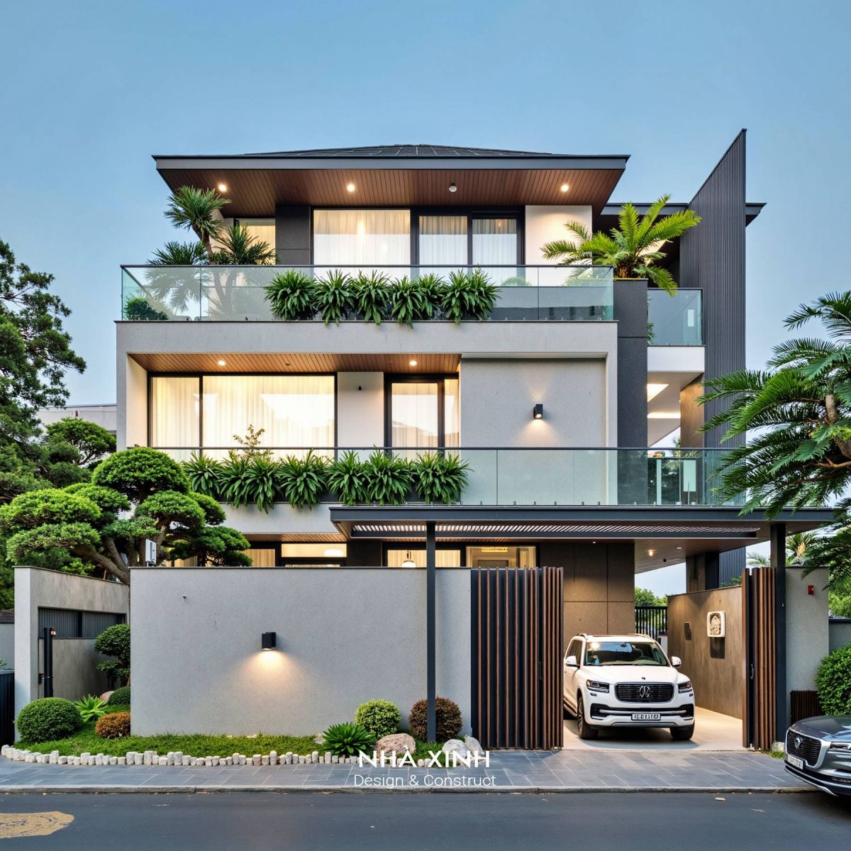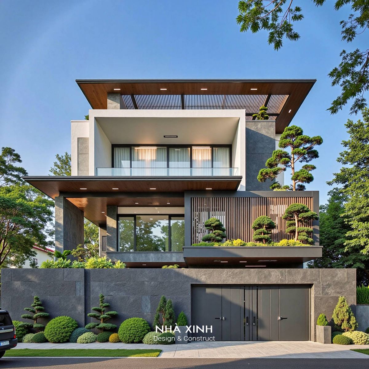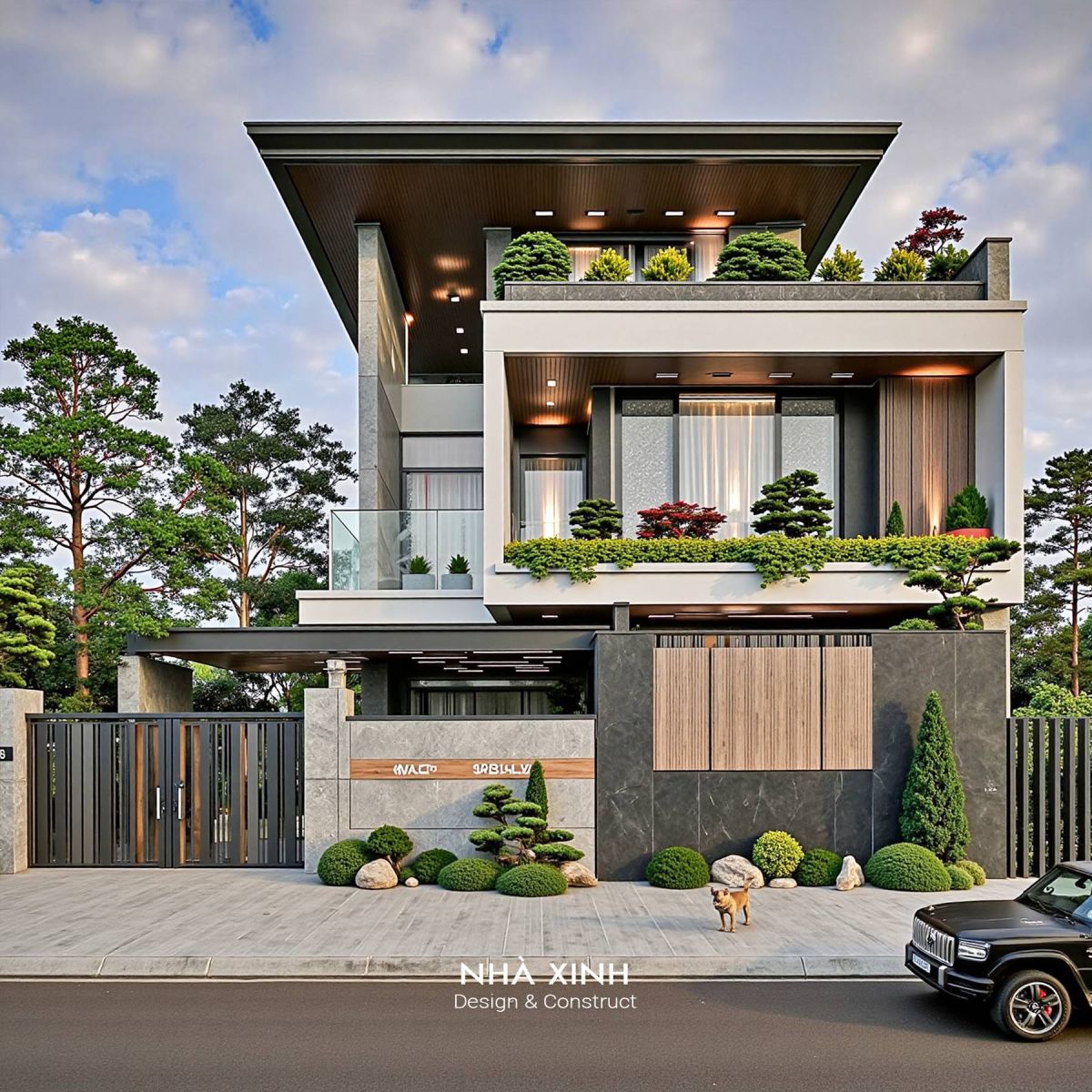 Kiến trúc vuông vắn, mạnh mẽ, tạo cảm giác vữgn chắc và hiện đại. Có thể tận dụng mái làm sân thượng, vườn treo hoặc khu BBQ.