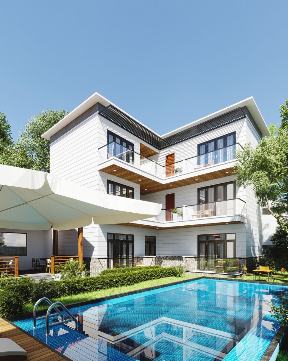 Thiết kế biệt thự 2 tầng hiện đại có view hồ bơi đẹp