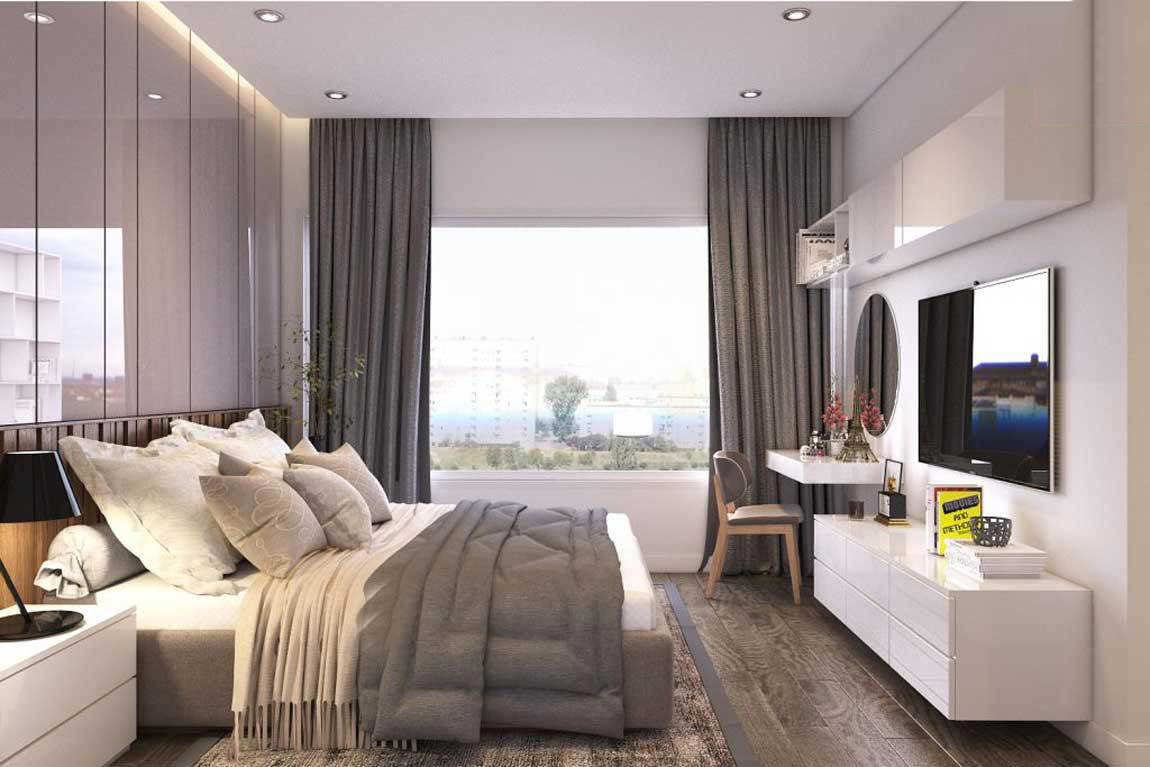Đầu tiên là nội thất phòng ngủ xây dựng theo thiết kế hiện đại, view rộng và có khung cửa sổ nhìn ra toàn thành phố. Từ phòng ngủ, gia chủ có thể ngắm cảnh qua thành phố thông qua cửa kính trong suốt hoặc đi ra view ban công hít thở không khí trong lành. Nội thất căn hộ trong phòng ngủ được lựa chọn tỉ mỉ, chủ yếu sử dụng màu trắng và xám để tạo sự thân thiện và cảm giác thoải mái. Chăn và rèm khung cửa cùng tông màu xám nhã nhặn, gối cùng với bộ ga đệm là màu trắng lịch thanh thoát.